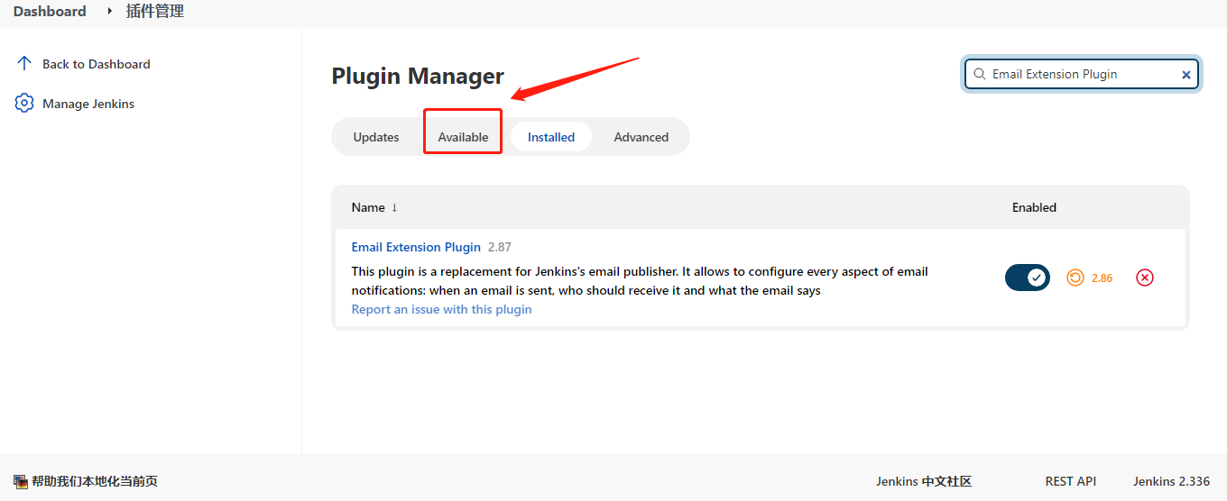 可以通过系统管理→管理插件→可选插件,选择Email Extension Plugin插件进行安装: