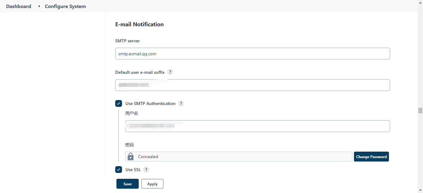 配置内容如下,和Email Extension Plugin插件同样的配置,可以通过勾选通过发送测试邮件测试配置按钮来测试配置是否成功发送邮件,如下图: