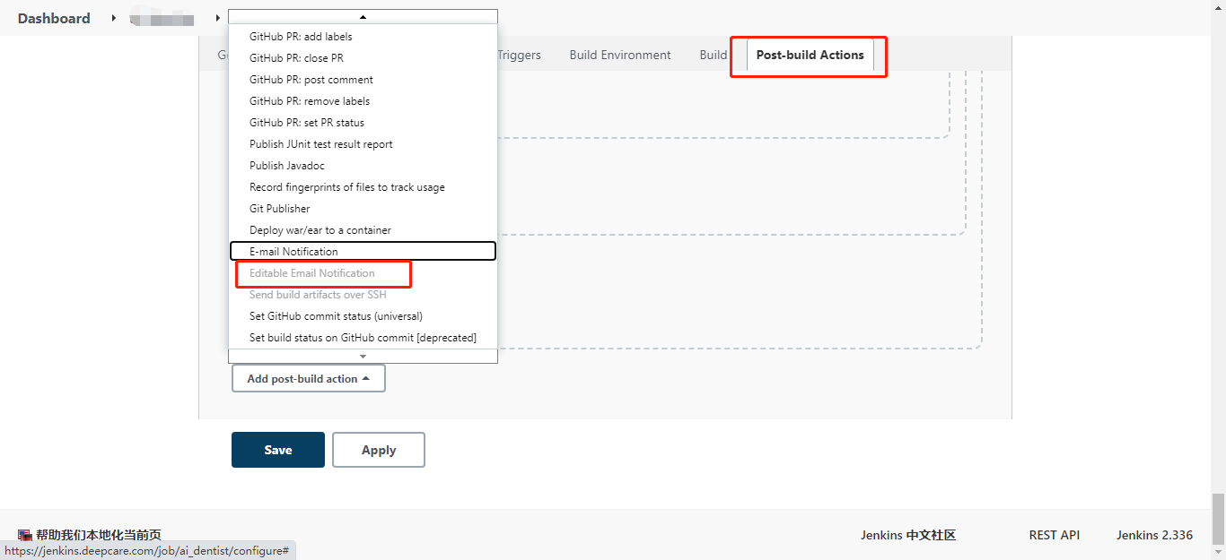 进入系统配置页面后,点击上方的构建后操作选项,配置内容如下:
