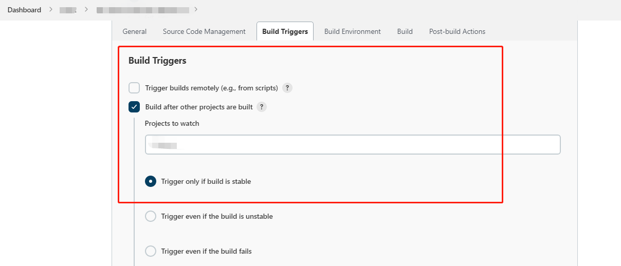 1、先新建一个JOB 2、编辑配置 3、勾选「其他工程构建后触发」 4、填写你的项目名 5、去构建你自己的项目,试试;看看老徐的这个项目是否自动构建 作者: 张存 文章链接: https://blog.zhangcun.store/2022/04/30/jenkins-qi-ta-xiang-mu-gou-jian-wan-cheng-hou-zi-dong-hong-fa-wo-de-xiang-mu-gou-jian/ 版权声明: 本网站所有文章除特别声明外,均采用 CC BY-NC-ND 4.0 许可协议。转载请注明出处! 上一篇: Linux查看物理CPU个数、核数、逻辑CPU个数 下一篇: pip install cupy安装缓慢,安装cupy-cuda101 (for CUDA 10.1)代替 你的赏识是我前进的动力 支付宝 微信